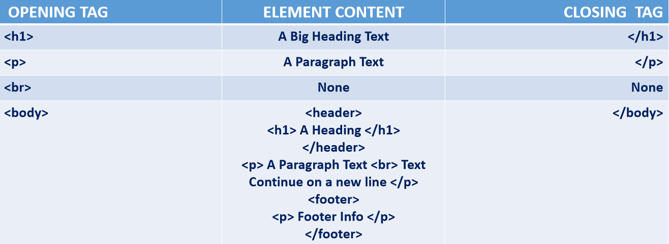 5. Be Reminded that, An Element is comprised of both the opening tag and the closing tag, with the contents inbetween both tags.